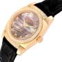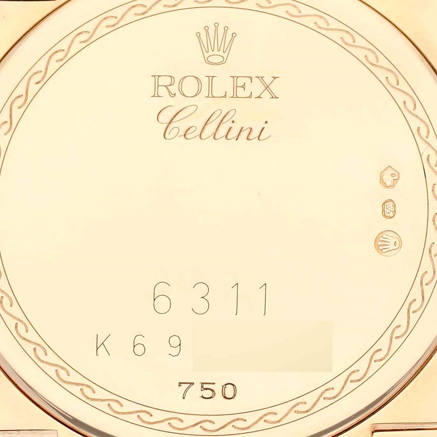 Replica Rolex Cellini Cestello Yellow Gold Mother of Pearl Diamond Ladies Watch 6311. Quartz movement. 18k yellow gold cushion case 26.0 mm in diameter. Rolex logo on the crown. Case is set with replica Rolex factory diamonds on the top and bottom. 18k yellow gold replica Rolex factory diamond bezel. Scratch resistant sapphire crystal. Black Tahitian mother of pearl dial with raised Roman numeral hour markers. Black leather strap with 18k yellow gold deployant clasp.