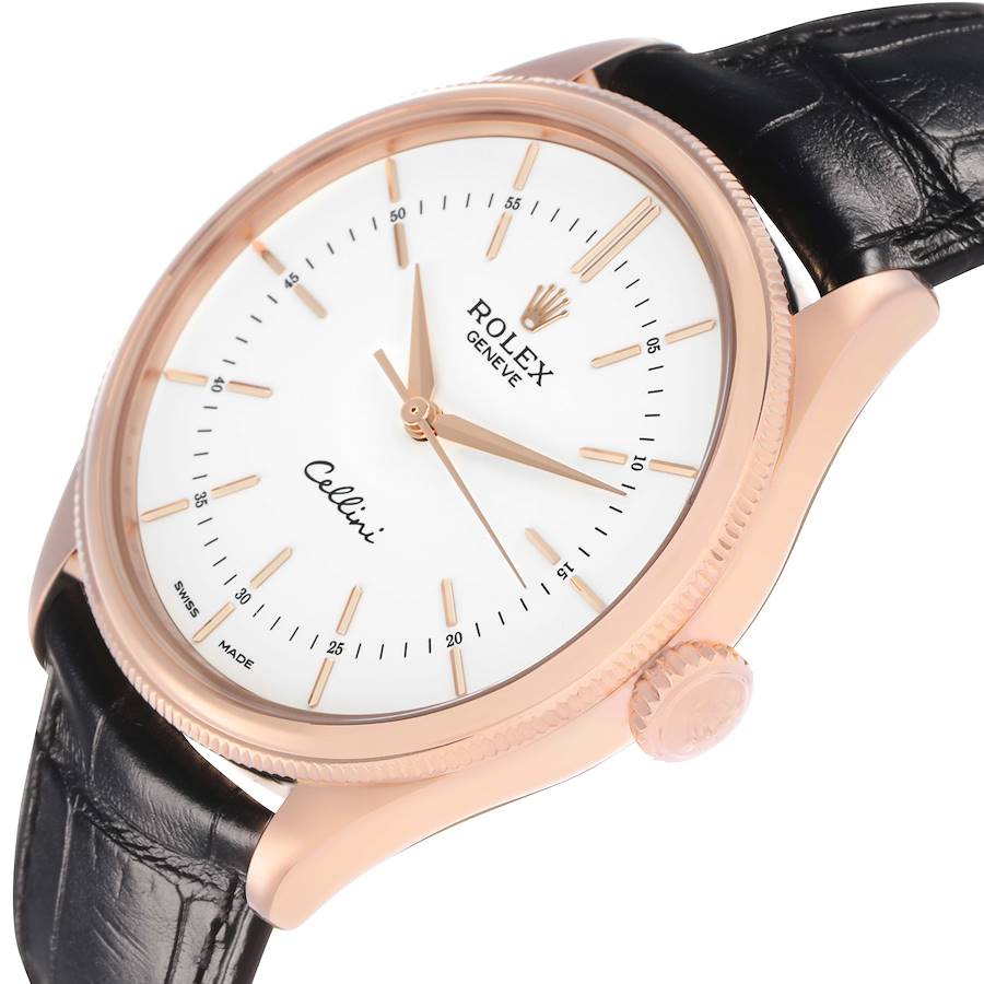 Replica Rolex Cellini Time Rose Gold White Dial Mens Watch 50505. Officially certified chronometer automatic self-winding movement. 18k rose gold round case 39 mm in diameter. Rolex logo on an 18k rose gold crown. 18k rose gold doubled domed and fluted bezel. Scratch resistant sapphire crystal. White lacquered dial with 18k rose gold baton hour markers and dauphine hands. Fine printed minute/seconds track. Centre hour, minute, and seconds 18k rose gold hands. Black leather strap with an 18k rose gold tang buckle.