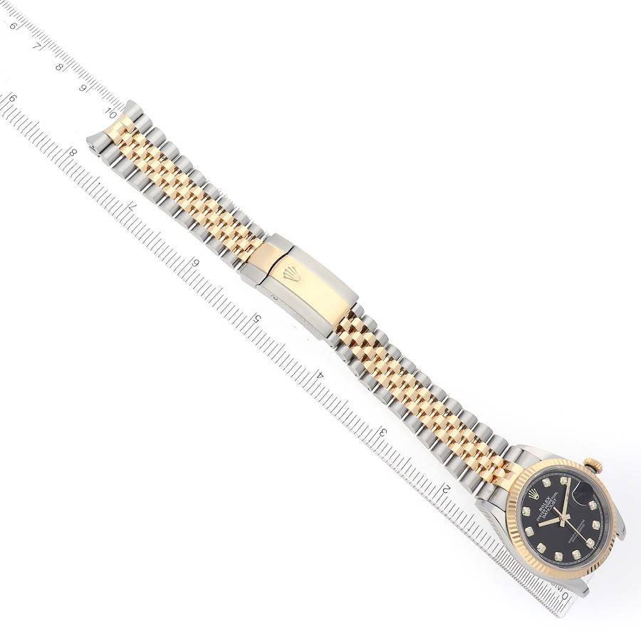 Replica Rolex Datejust Steel Yellow Gold Black Diamond Dial Mens Watch 126233 Box Card. Officially certified chronometer automatic self-winding movement. Stainless steel and 18k yellow gold case 36.0 mm in diameter. Rolex logo on the 18k yellow gold crown. 18k yellow gold fluted bezel. Scratch resistant sapphire crystal with cyclops magnifier. Black dial with Replica Rolex factory diamond hour markers. Date window at 3 o'clock aperture. Stainless steel and 18k yellow gold jubilee bracelet with an oysterlock clasp. Fits a 7.5" wrist.