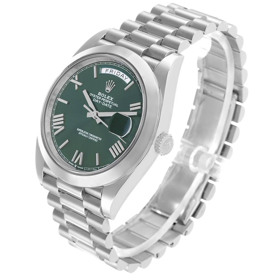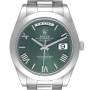 Replica Rolex President Day-Date 40 Platinum Roman Dial Watch 228206 Box Card. Officially certified chronometer self-winding movement. Platinum oyster case 40.0 mm in diameter. Rolex logo on a crown. Platinum smooth bezel. Scratch resistant sapphire crystal with Cyclops magnifier. Green dial with raised Roman numeral hour markers. An aperture for day of the week at 12, and aperture for date at 3. Platinum presidential bracelet witha folding hidden clasp. Fits a 7.5" wrist.