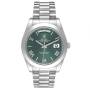 Dial: Green dial with raised Roman numeral hour markers. An aperture for day of the week at 12, and aperture for date at 3.