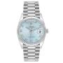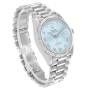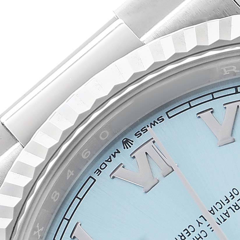 Dial: Ice blue dial with Roman numeral hour markers and baton hands. Date window at the 3 o'clock aperture. Day window at 12 o'clock. Minute markers around the outer rim.