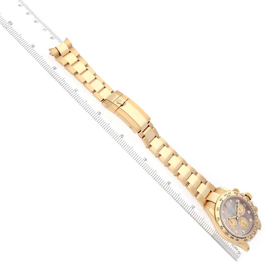 Replica Rolex Daytona Yellow Gold MOP Diamond Mens Watch 116508. Officially certified chronometer self-winding movement. 18K yellow gold case 40.0 mm in diameter. Special screw-down push buttons. Triplock winding crown protected by the crown guards. 18K yellow gold tachymeter engraved bezel. Scratch resistant sapphire crystal. Tahitian mother of pearl dial with replica Rolex factory diamond hour markers. Outer 1/5th seconds track. Gold outlined subsidiary dials -- running small seconds, the 12-hour, and 30-minute registers. Luminous yellow gold baton hands. 18K yellow gold oyster bracelet with flip-lock clasp. Fits an 8" wrist.