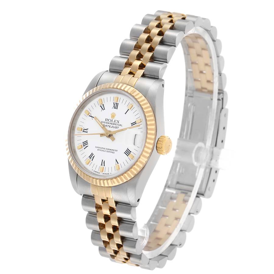 Replica Rolex Datejust Steel Yellow Gold White Dial Mens Watch 16233 Box Papers. Officially certified chronometer automatic self-winding movement. Stainless steel case 36.0 mm in diameter. Rolex logo on the yellow gold crown. 18k yellow gold fluted bezel. Scratch resistant sapphire crystal with a cyclops magnifier. White dial with raised yellow gold baton hour markers and Roman numerals. Date window at the 3 o'clock aperture. Stainless steel and 18k yellow gold jubilee bracelet with a fold-over clasp. Fits a 7 1/4" wrist.