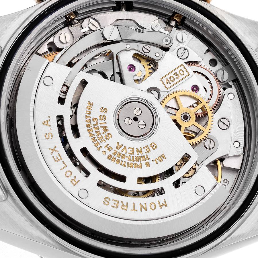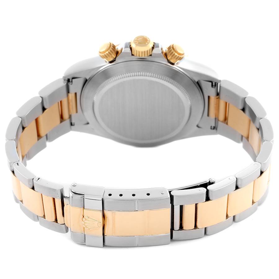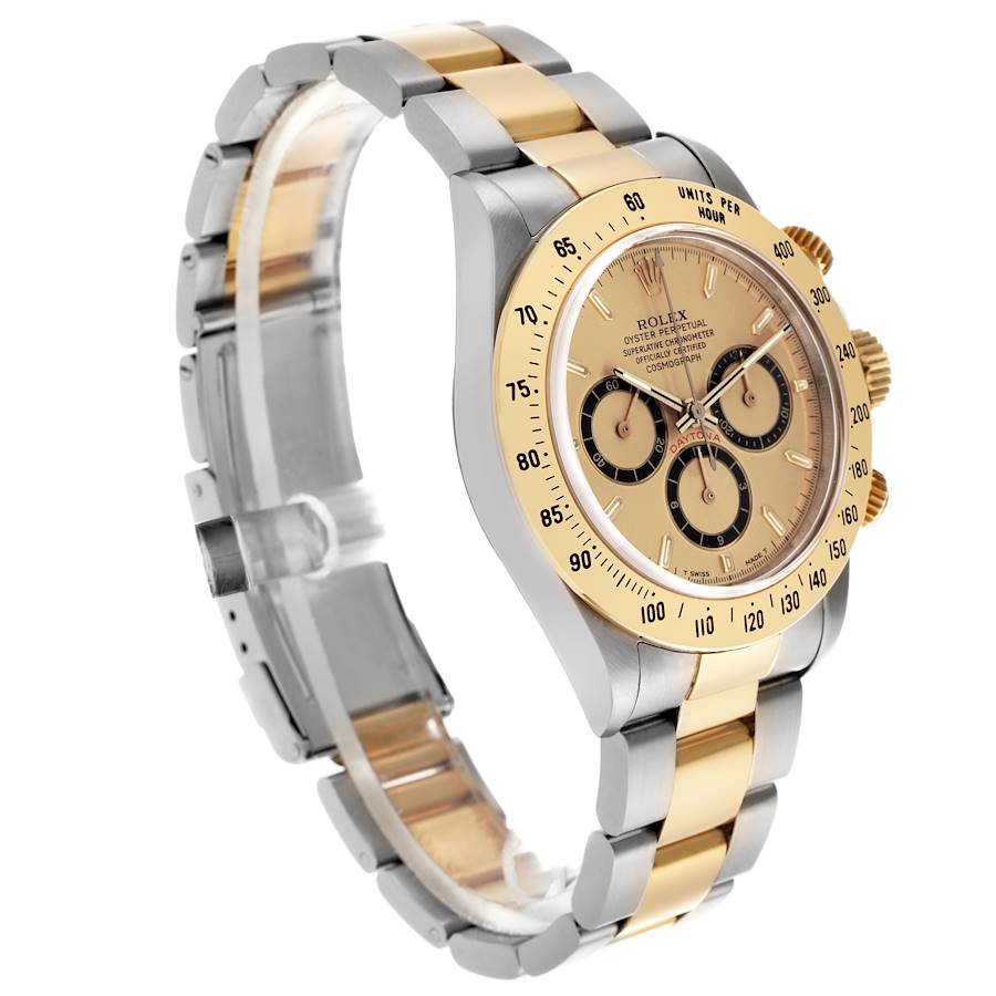 Replica Rolex Daytona Inverted 6 200 Meter Zenith Movement Steel Yellow Gold Mens Watch 16523. Officially certified chronometer automatic self-winding chronograph Zenith Movement. Stainless steel and 18K yellow gold case 40.0 mm in diameter. Special screw-down push buttons. Triplock winding crown protected by the crown guards. 18K yellow gold rare 200 meter tachymeter scale engraved bezel. Scratch resistant sapphire crystal. Champagne dial with yellow gold baton hour markers and hands. Outer 1/5th seconds track. Black-outlined subdials for running seconds and the 12-hour and 30-minute chronograph registers. Inverted 6 on the hour subial. Stainless steel and 18K yellow gold oyster bracelet with flip-lock clasp. Will fit an 8" wrist.