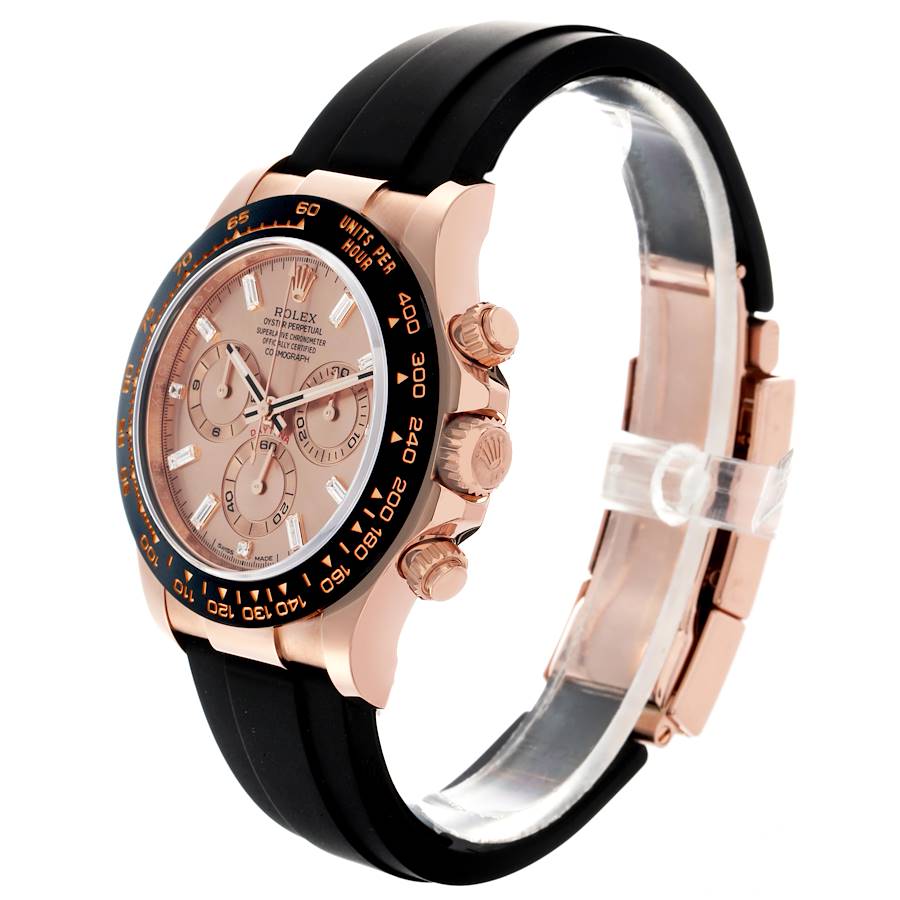 Replica Rolex Daytona Rose Gold Everose Diamond Automatic Mens Watch 116515. Officially certified chronometer self-winding movement. 18K rose gold oyster case 40.0 mm in diameter. Special screw-down push buttons operate the chronograph functions. Rolex logo on the crown. 18K rose gold ceramic bezel with a black ceramic insert, engraved with the tachymeter scale. Scratch resistant sapphire crystal. Sundust dial with replica Rolex factory baguette diamond hour markers and luminescent rose gold baton hour markers. Three engine-turned subdials -- running small seconds and the 30-minute and 12-hour chronograph registers. Outer minute and 1/5-seconds stick markers. Black rubber Oysterflex bracelet with an 18k rose gold flip-lock clasp.