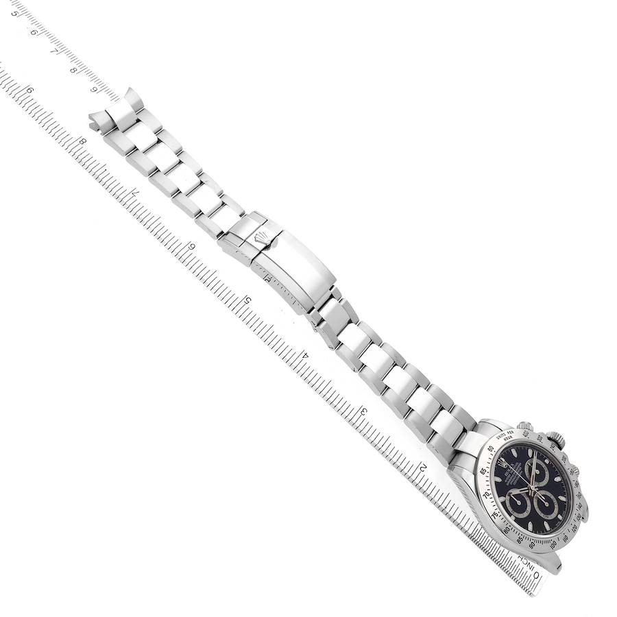 Replica Rolex Daytona Steel Black Dial Mens Watch 116520. Officially certified chronometer automatic self-winding movement. Stainless steel case 40 mm in diameter. Special screw-down push buttons. Polished stainless steel bezel with engraved tachymeter scale. Scratch-resistant sapphire crystal. Black dial with luminous hands and hour markers. Three stainless steel outlined chronograph subdials -- running small seconds, 30 minutes, and 12 hours. Stainless steel oyster bracelet with flip-lock clasp. Fits a 7 3/4" wrist.