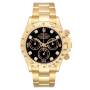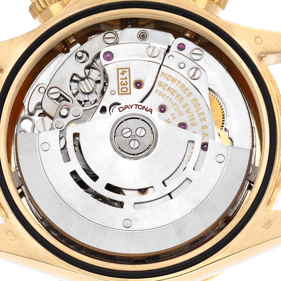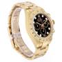 Dial: Black dial with replica Rolex factory diamond hour markers and yellow gold baton hands. Outer 1/5th seconds track. Three gold outlined subdial chronograph registers -- running small seconds at 6 o'clock, 30-minutes at 3 o'clock, and 12-hour at 9 o'clock.