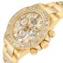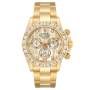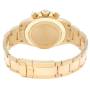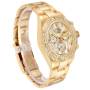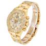 Dial: Yellow mother-of-pearl dial with luminescent-inlay yellow gold baton hands and replica Rolex factory diamond hour markers. Raised yellow gold Arabic numerals at 15, 30, and 45 minute positions. 18k yellow gold arrow-tipped central chronograph hand. Three recessed chronograph subdials -- 60 seconds at 6 o'clock, 30 minutes at 3 o'clock, and 12 hours at 9 o'clock. Outer minute marker track.