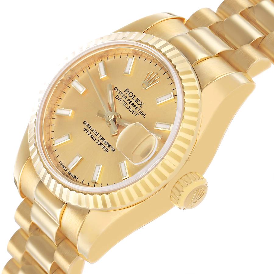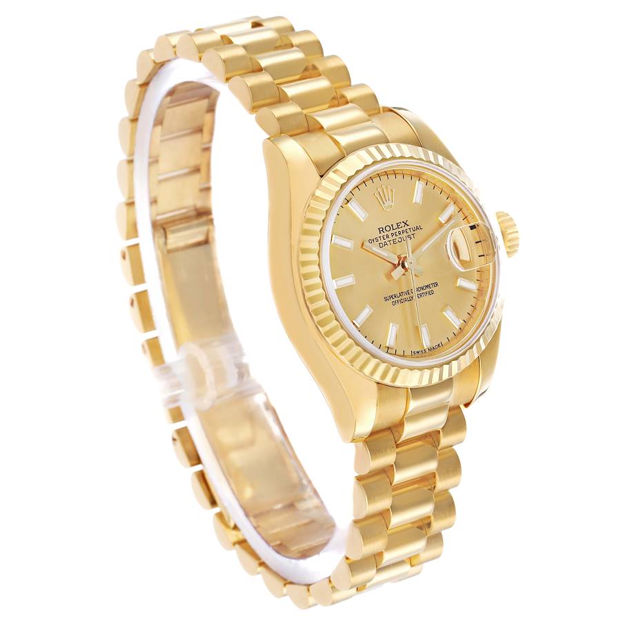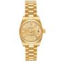 Replica Rolex President Datejust Yellow Gold Diamond Dial Ladies Watch 179178. Officially certified chronometer self-winding movement. 18k yellow gold oyster case 26.0 mm in diameter. Rolex logo on a crown. 18k yellow gold fluted bezel. Scratch-resistant sapphire crystal with cyclops magnifier. Champagne dial with yellow gold luminescent baton hands and hour markers. Date calendar at 3 o'clock aperture. 18k yellow gold president bracelet with a hidden clasp. Fits a 6 1/4" wrist.
